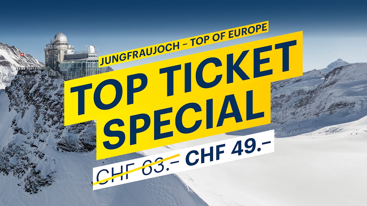 Das Winterparadies vor Eiger, Mönch und Jungfrau bietet allen, die hoch hinauswollen, einen weiteren Höhepunkt: das Jungfraujoch. Mit dem «Top Ticket» fahren Sie für nur CHF 63.- auf das Jungfraujoch - Top of Europe.