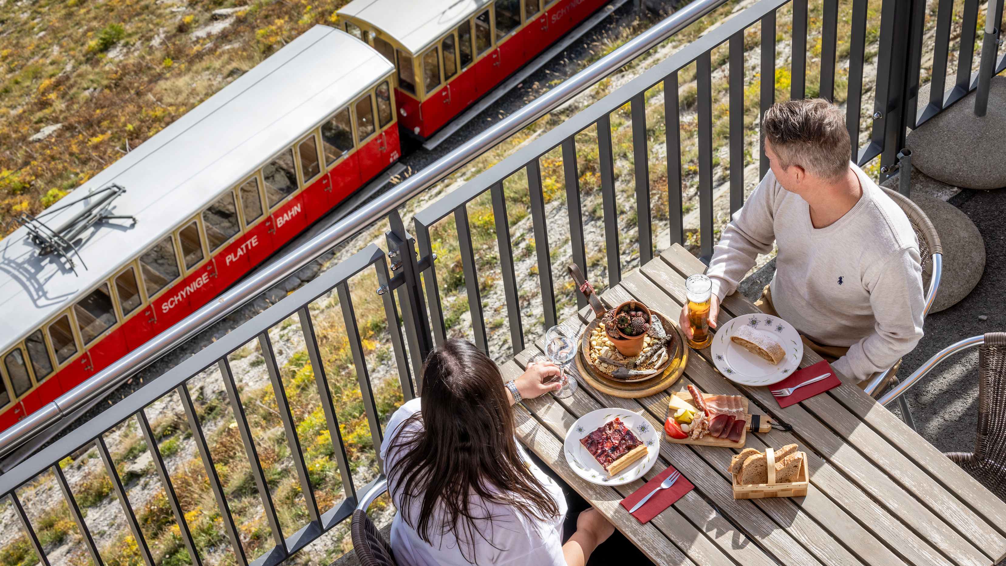 Am Nachmittag gemütlich einkehren und die Aussicht geniessen: Mit dem Zvieri-Ticket kombinieren Sie die nostalgische Bahnfahrt mit einer feinen Zwischenverpflegung im Panorama-Restaurant Schynige Platte auf 1967 m ü. M.