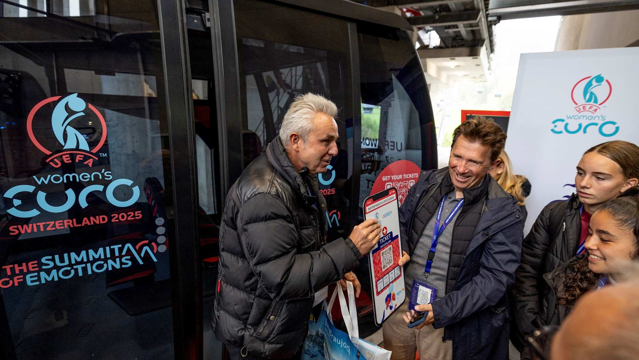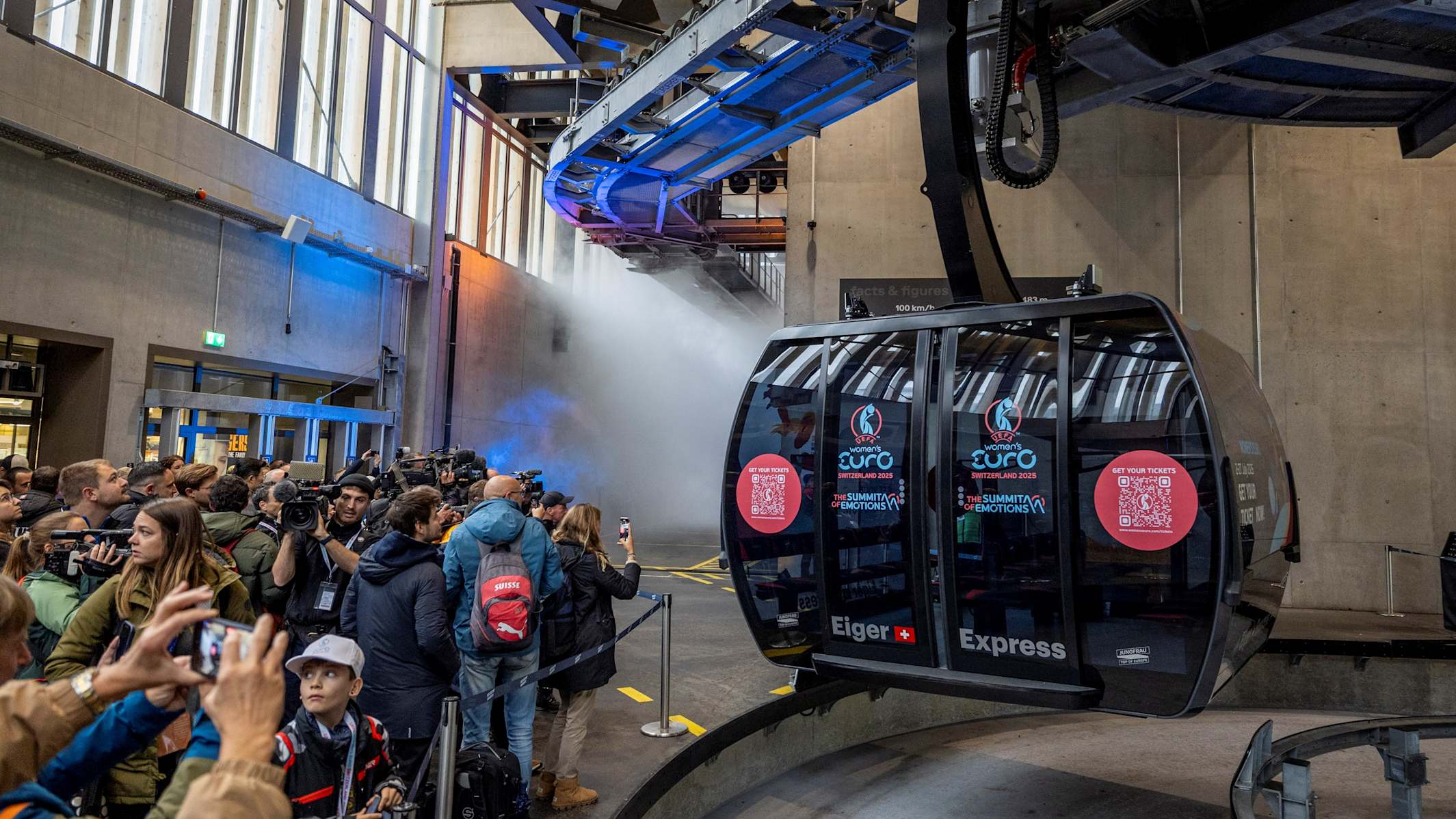 Anpfiff zum exklusiven Spiel auf dem Jungfraujoch – Top of Europe vor zahlreichen geladenen Gästen und Medienschaffenden war um 11.45 Uhr. Bereits vor dem Spiel, unten im Grindelwald Terminal, kam es zu einer Premiere: Die Kabine Nummer 1 der 3S-Bahn Eiger Express wurde exklusiv für die UEFA Women’s EURO 2025 «gebrandet» und wird für knapp ein Jahr so unterwegs sein. «Dies ist ganz klar einmalig. Nach dem Finale nächstes Jahr wird die Kabine wieder im gewohnten Kleid fahren», erklärte Urs Kessler.