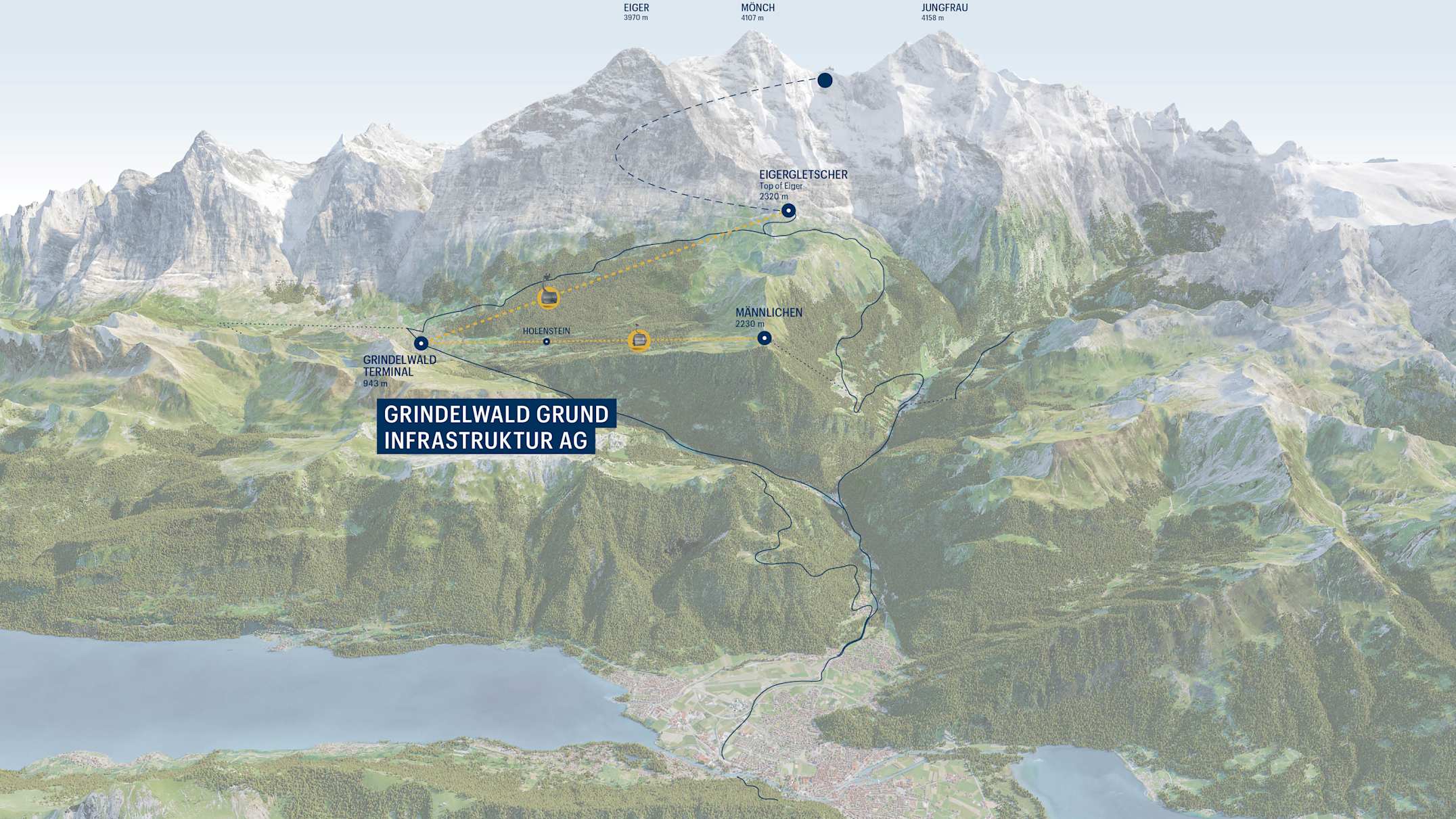 Grindelwald Grund Infrastruktur AG is the owner of infrastructure built for the V-Cableway project in Grindelwald Grund, namely the Grindelwald Terminal and the multi-storey car park. It maintains, manages and rents out these facilities. In addition, it has a mandate for the operation of the Eiger Express tricable gondola and the Grindelwald-Männlichen gondola.