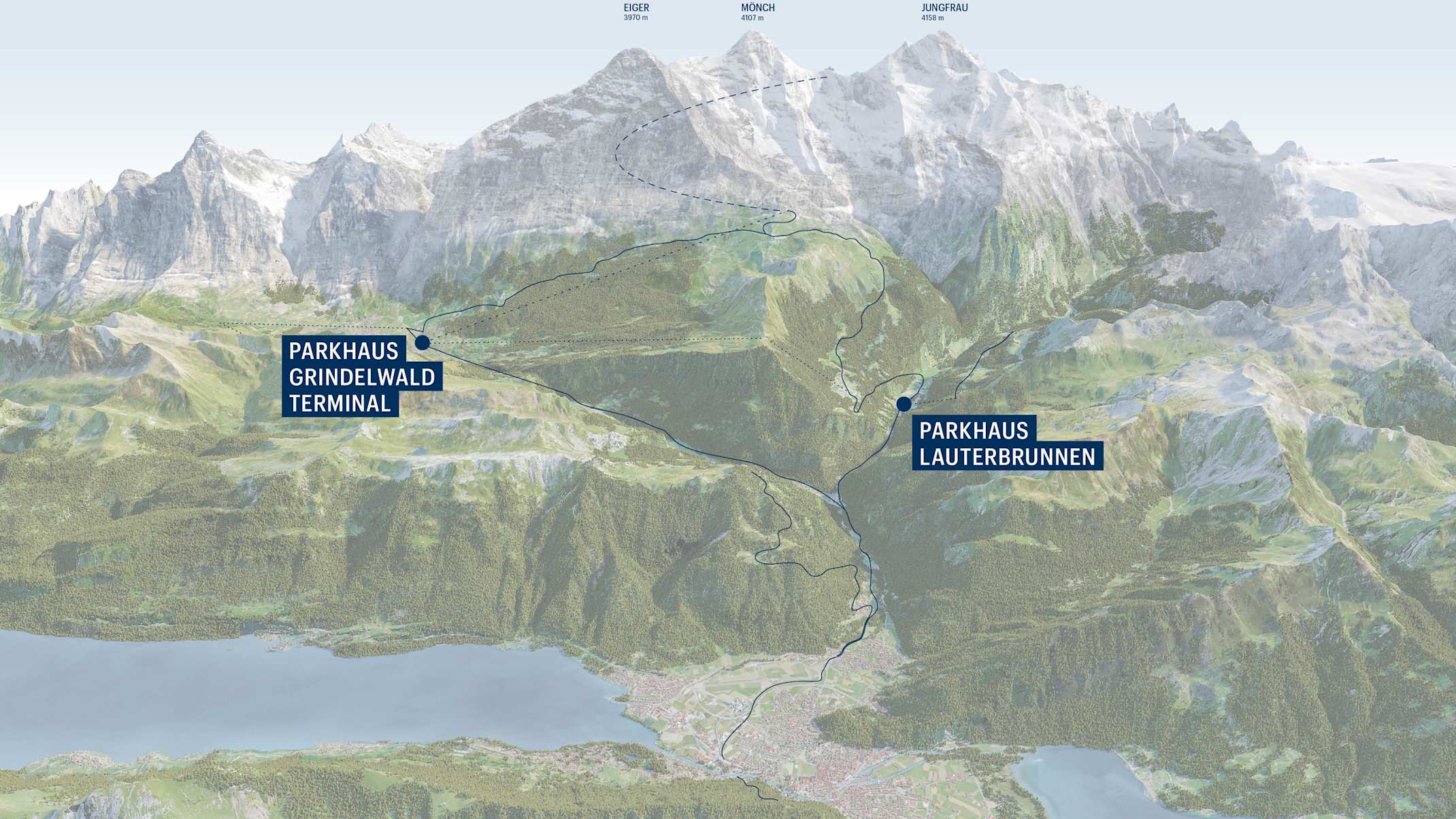 Thanks to its location at the railway station and the bus terminal, the car park Lauterbrunnen is the central transfer point between private transport and the car-free resorts of Mürren and Wengen. The Grindelwald Terminal car park at the entrance to the village helps to reduce feeder traffic in the village. Guests can easily get of the Eiger Express tricable gondola, the Grindelwald-Männlichen gondola or the Bernese Oberland Railway stop via a footbridge.