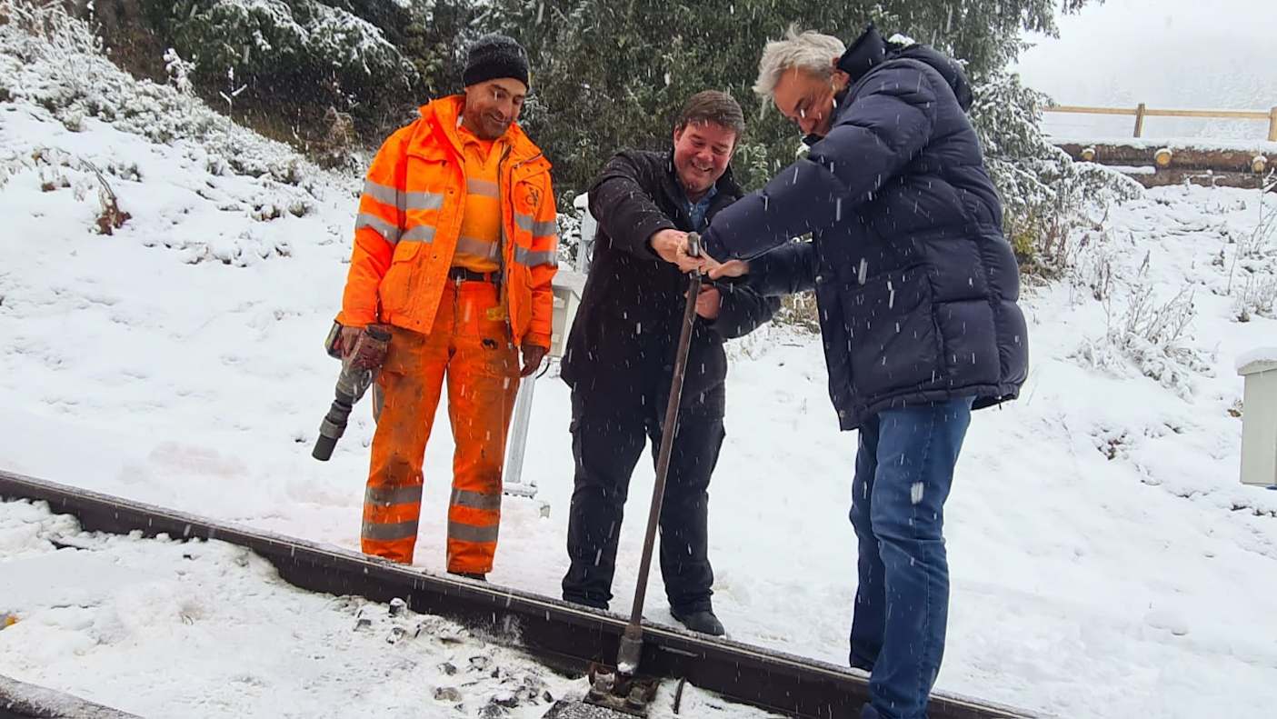 After around six years of major and minor construction phases, work on the renovation of the Grütschalp-Mürren adhesion railway, part of the Lauterbrunnen-Mürren mountain railway (BLM), is coming to an end: On Friday, 10 November 2023, the last sleeper was laid at Winteregg during a media event. “The renovation of the Grütschalp-Mürren adhesion railway – including the Grütschalp, Winteregg and Mürren stations – is very important as a feeder for the car-free village of Mürren for the long-term improvement in the attractiveness of the location”, explained Urs Kessler, Director of Jungfrau Railways, on the occasion of the laying of the final sleeper. “These were intensive construction phases over a long period of time, so I’m happy that we were able to complete the work on the infrastructure around the adhesion railway on schedule without any incidents”, said Stefan Wittwer, Head of BLM.