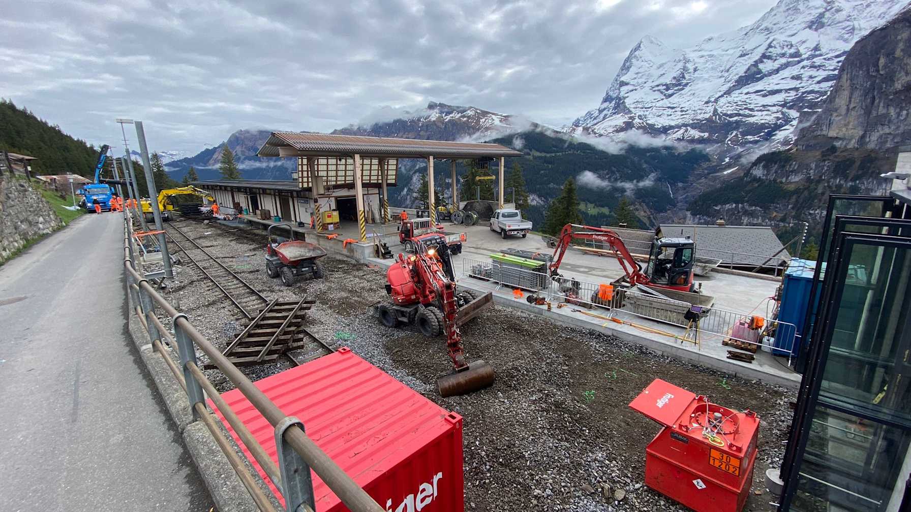 However, the centrepiece of the work is the complete renovation of the BLM line between Grütschalp and Mürren. Several thousand tonnes of ballast, around 8,000 new oak sleepers and around 9,600 metres of track in total were laid in several stages; for example, during the intensive construction phase in autumn 2021, when the second section from Grütschalp to Winteregg station was relocated.