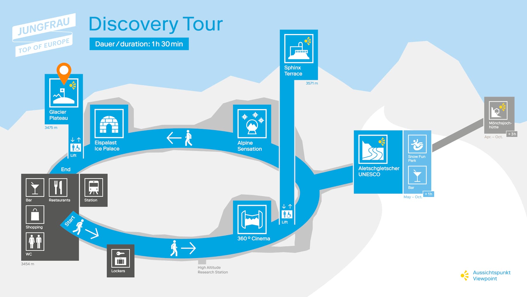The highest railway station in Europe, located in the heart of the UNESCO World Heritage Site. Experience the spectacular view of the longest glacier in the Alps – at 3,454 metres above sea level.
