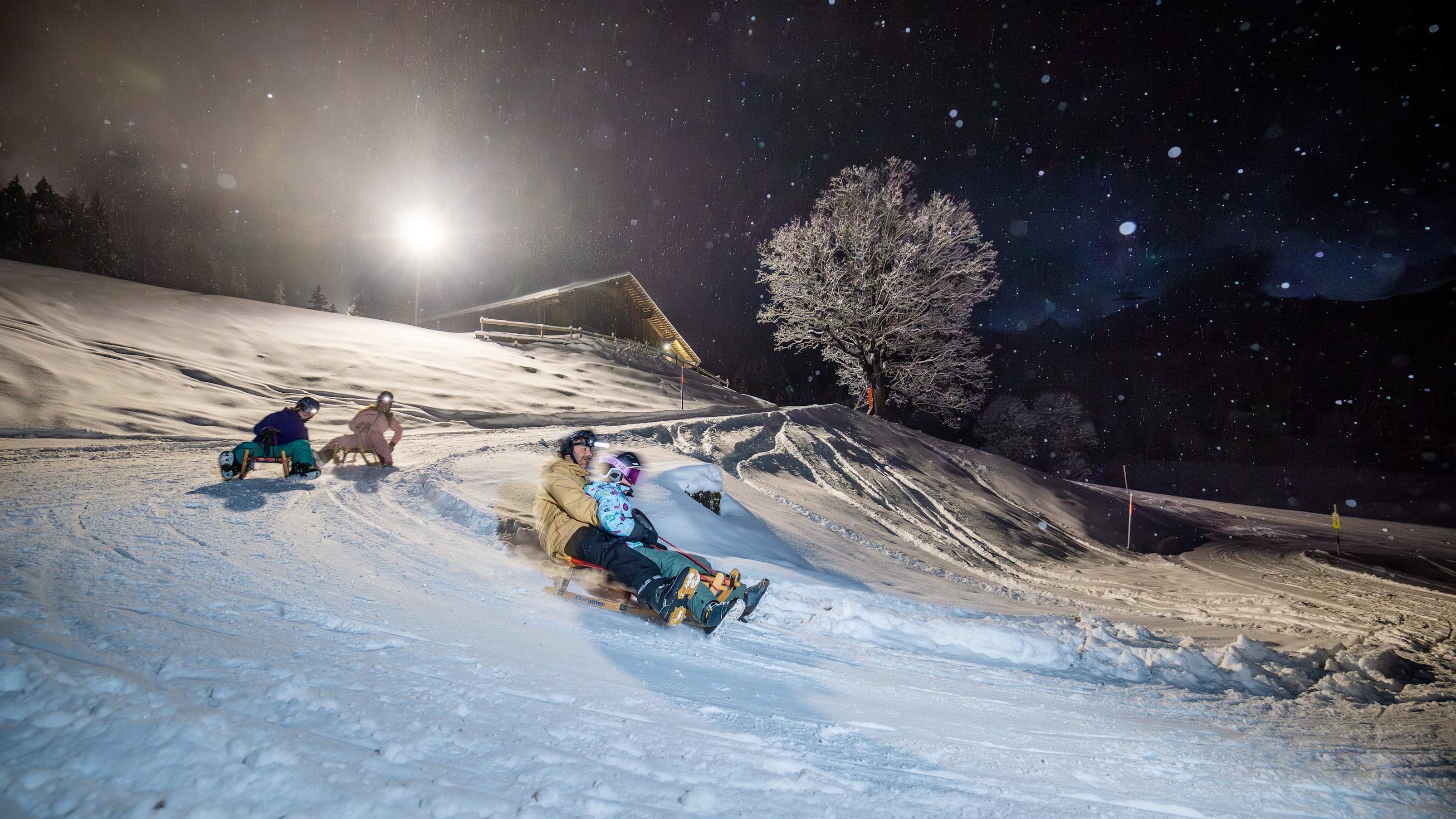 In the shadow of the Eiger with a dash into the valley: The Jungfrau Eiger Run is a spectacular sledging run by day with a gradient of up to 36 per cent. However, the 3.5 kilometre stretch from Alpiglen to Brandegg is even more exciting at night. The Wengernalpbahn also travels to Alpiglen in the evening – in just five minutes and as often as you like with the "Jungfrau Eiger Run Evening Ticket". The burned calories can be quickly regained with a fondue in the Alpiglen or Brandegg alpine chalets, where you can stay up all night – right next to the illuminated sledging run.