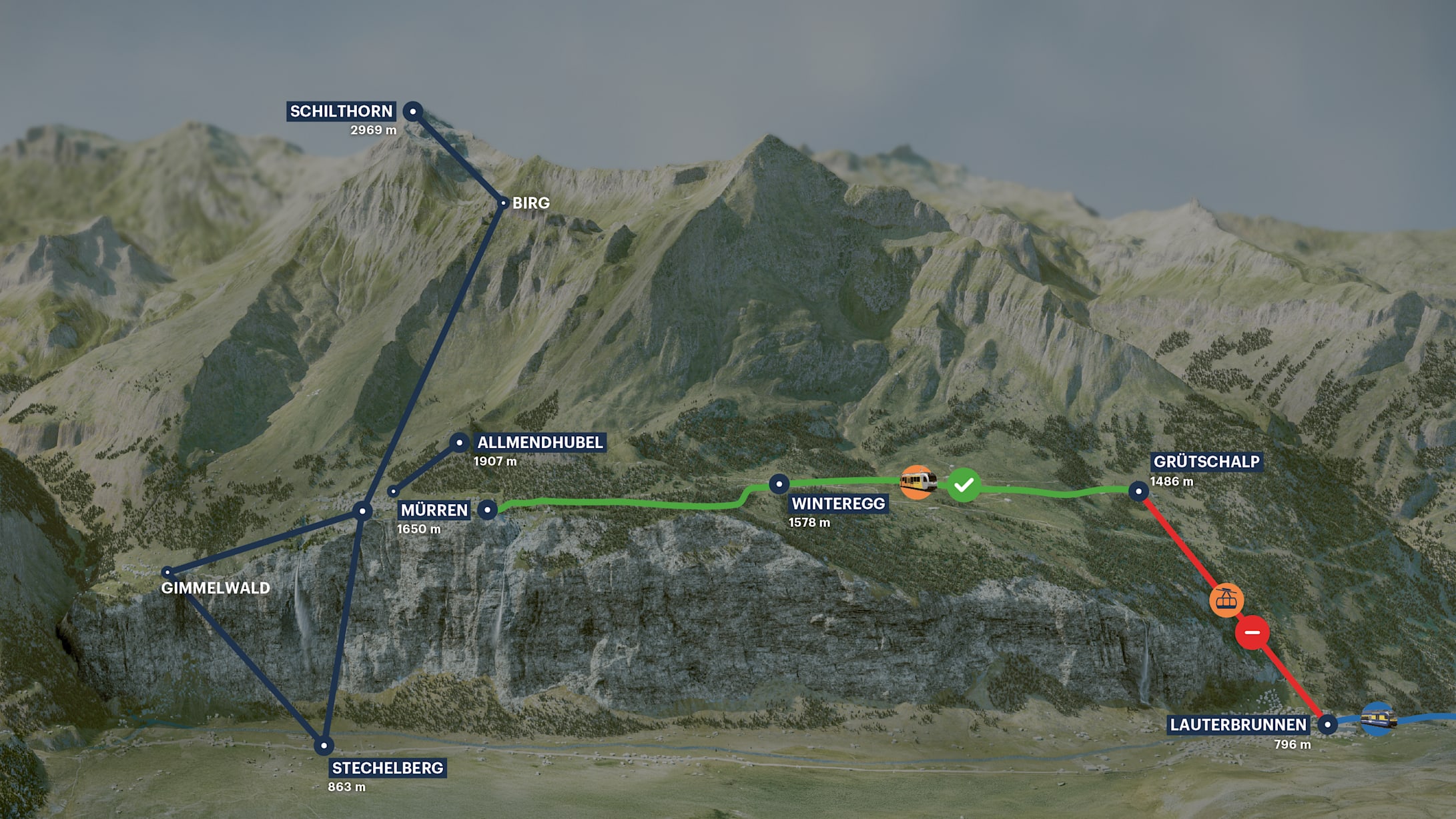 ⚠️ Maintenance notice The Lauterbrunnen–Grütschalp aerial cableway will be renewed in 2026 and will be out of operation from 13.04.–10.07.2026 due to maintenance work. Hourly trains between Grütschalp and Mürren: 02.05.–10.07.2026 |