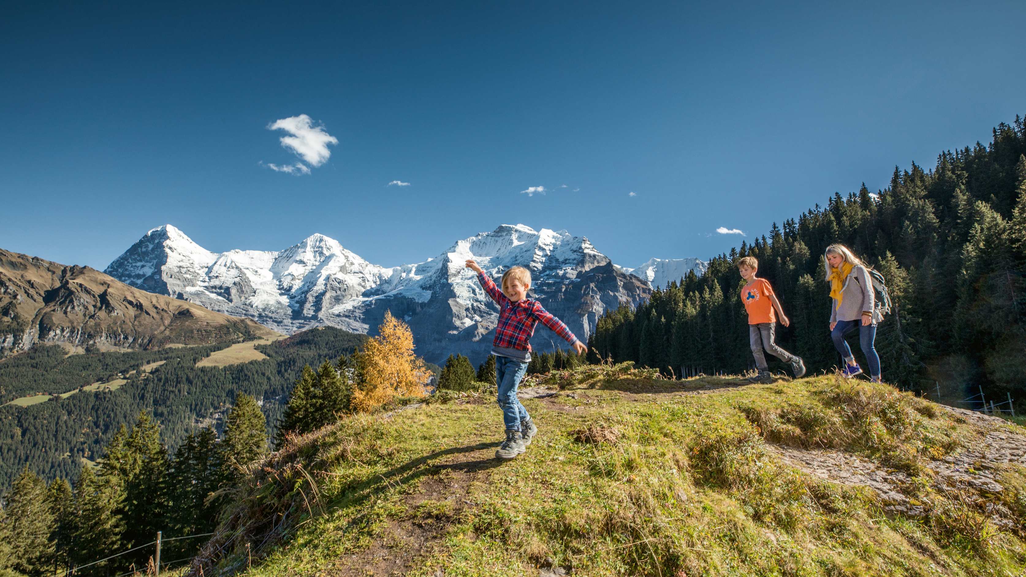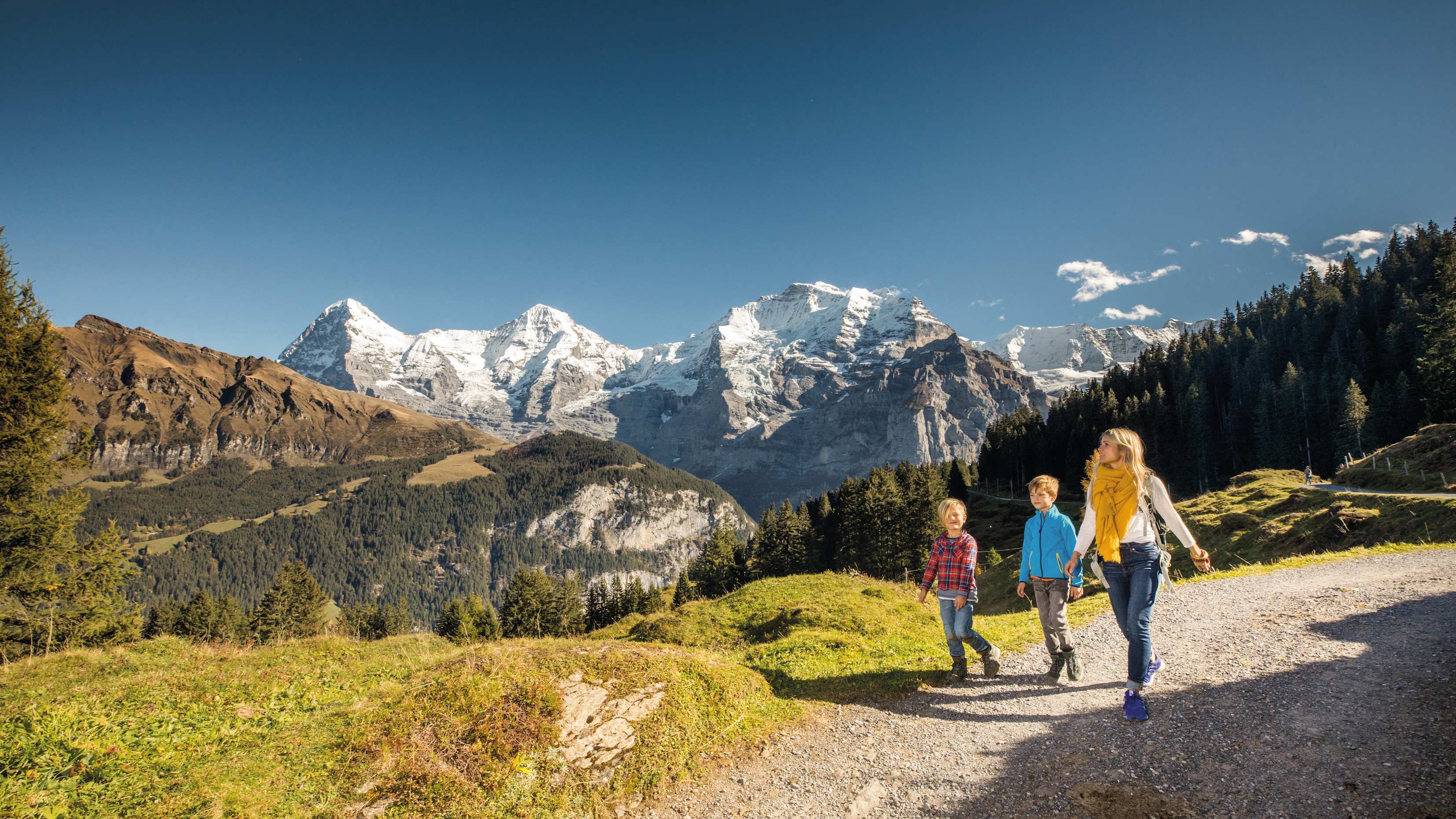 From the Grütschalp cable car station, a broad gravel path leads in a steady slope to the edge of the forest and continues through a magnificent mountain forest. The gate to the alp pastures also opens up spectacular views of the Eiger, Mönch and Jungfrau mountain chain on the opposite side of the valley. To the east, at the foot of the Männlichen chain, you can see the long-drawn-out settlement area of Wengen.