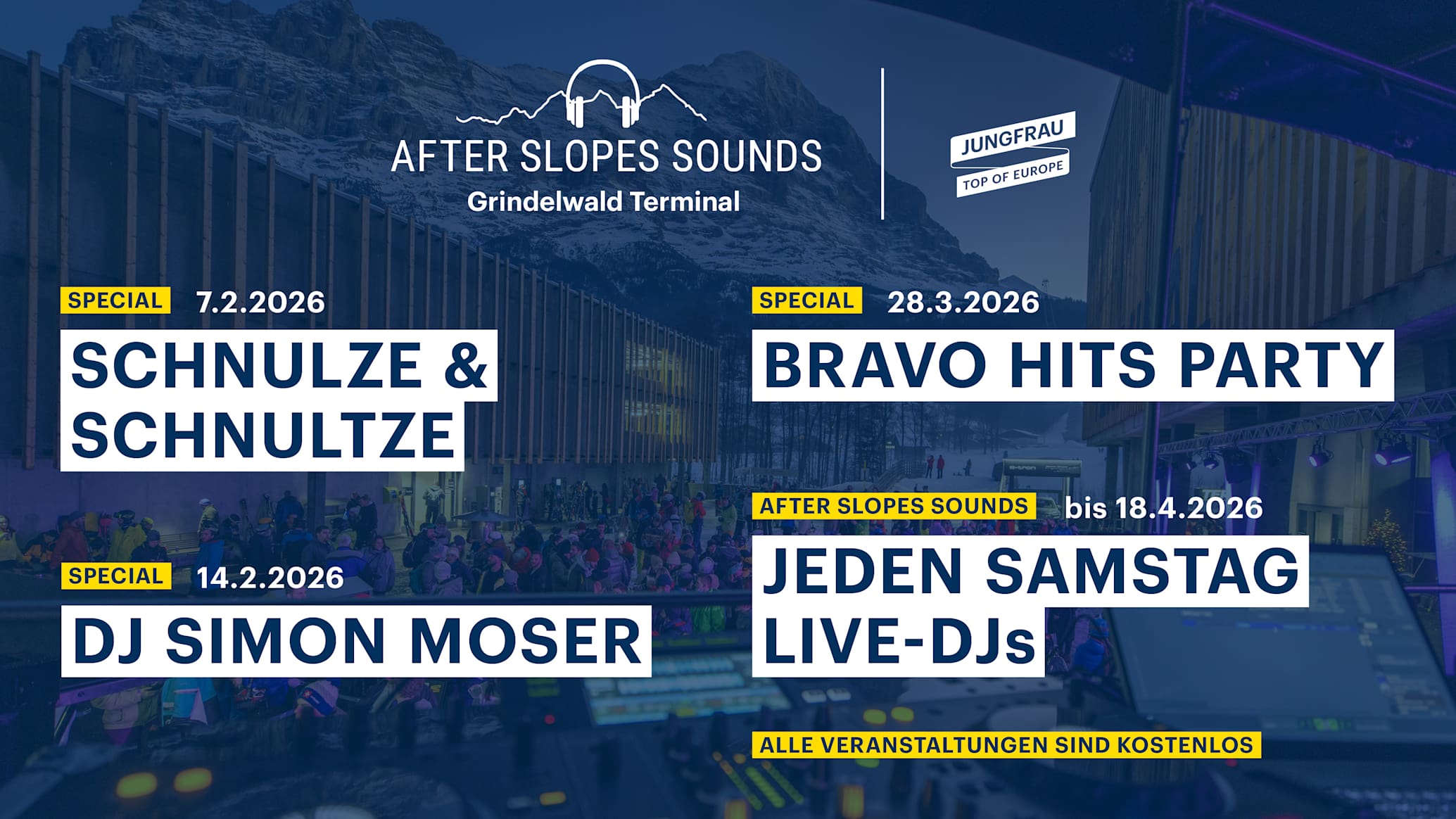 | Sam. 17.01.2026 | Lauberhorn / DJ Sir Driver & DJ Jumping Jack | 12:00 Uhr – Diffusion en direct de la course 14:00 - 19:00 Uhr – After Slopes Sounds 19:00 Uhr – Diffusion en direct de la ceremonie de remise des prix 19:30 - 21:00 Uhr – After Slopes Sounds |