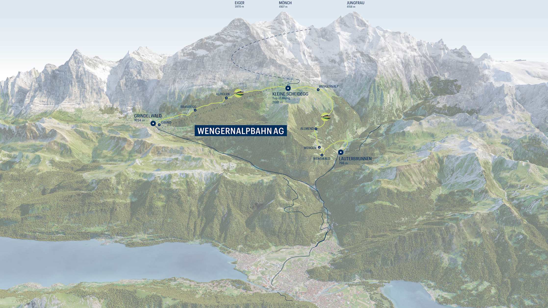 Die Wengernalpbahn (WAB) erschliesst von Lauterbrunnen und Grindelwald aus das Ausflugs- und Wintersportgebiet Kleine Scheidegg und dient als Zubringer zum Jungfraujoch – Top of Europe. Mit einer Länge von 19’114 Meter ist sie die längste durchgehende Zahnradbahn der Welt. Die Bahn stellt den Personentransport wie auch die Güterversorgung für den autofreien Wohn- und Ferienort Wengen sicher. Auf der Strecke Grindelwald-Kleine Scheidegg verkehren seit 2005 und auf der Strecke Lauterbrunnen-Kleine Scheidegg seit 2014 zehn moderne Niederflur-Panoramazüge, die eine Kapazität von je 152 Sitzplätzen aufweisen. Mit dem heute eingesetzten Rollmaterial beträgt die Reisezeit von Grindelwald-Grund zur Kleinen Scheidegg 24 Minuten und von Lauterbrunnen zur Kleinen Scheidegg 42 Minuten. Wengen wird ab Lauterbrunnen nach 12-minütiger Fahrt erreicht.